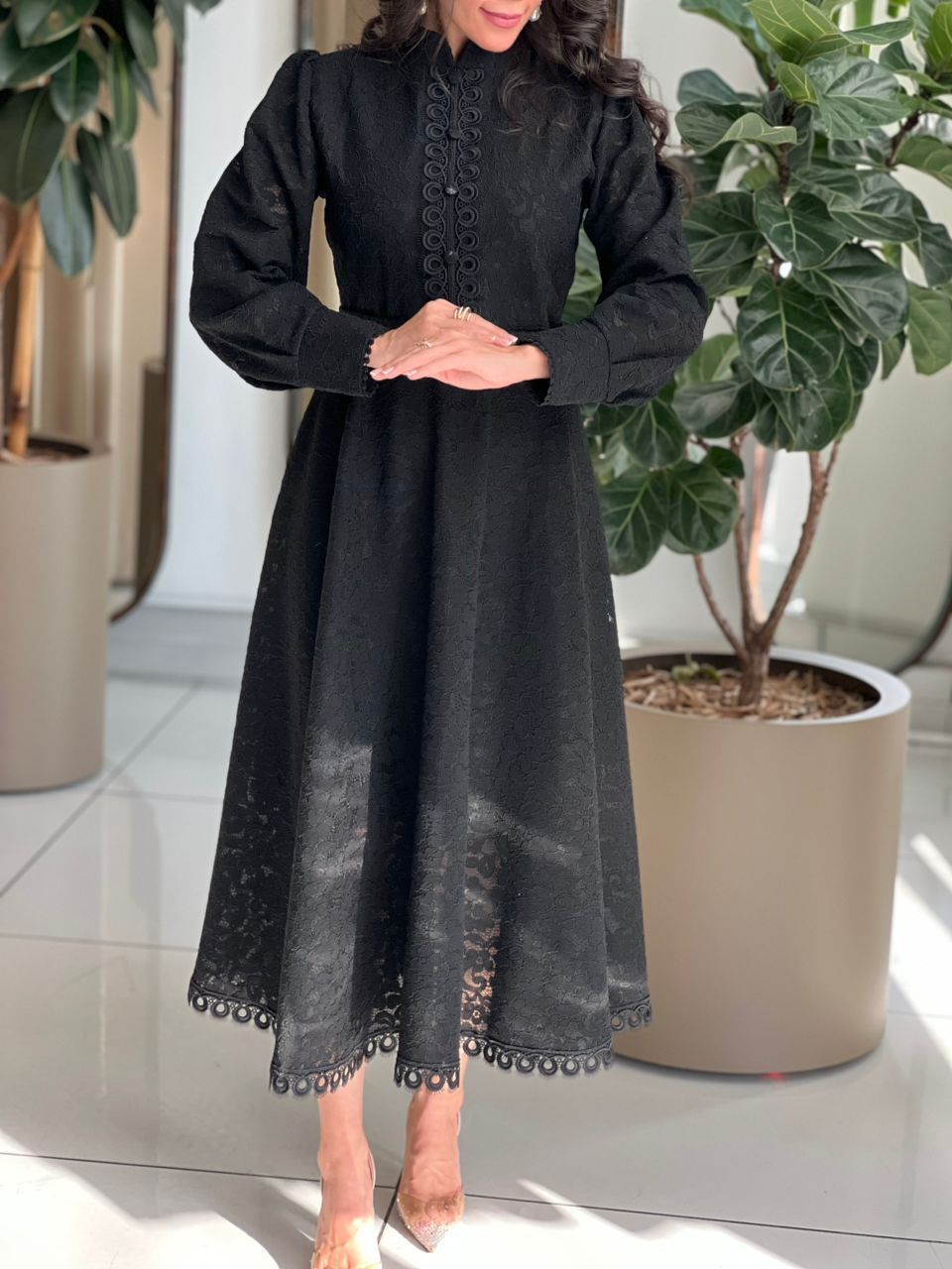 A timeless black net dress inspired by the elegance of the vintage era. Its sophisticated high neck is framed with delicate buttons, creating a refined, old-world charm that instantly elevates the silhouette. Full sleeves add to its classic grace, while the accompanying belt cinches the waist for a flattering, structured finish.
