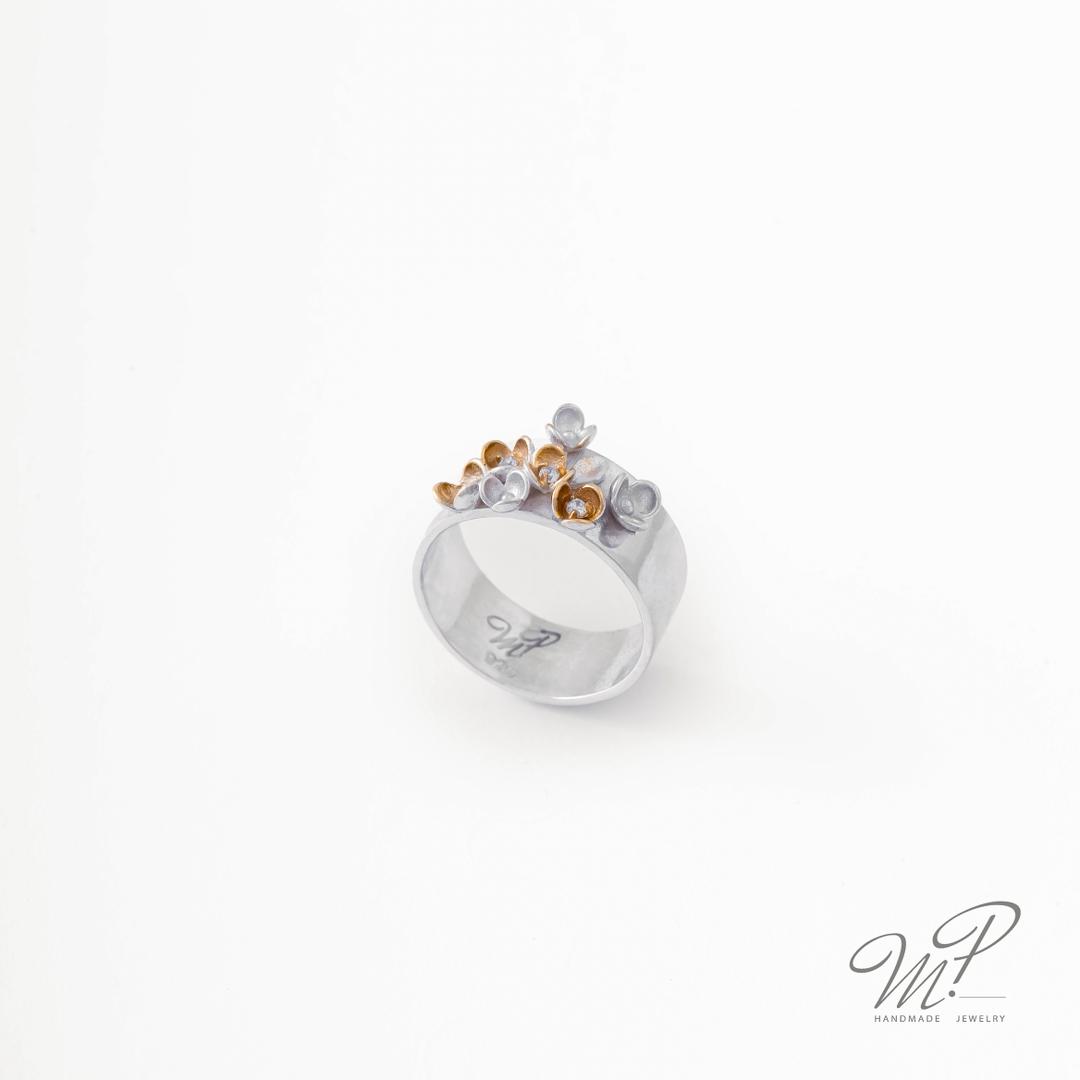 A silver ring adorned with three delicately bloomed flowers, two in silver and one accented with gold plating. Tiny crystal stones add a gentle sparkle, creating an elegant and feminine design with a subtle touch of contrast.
