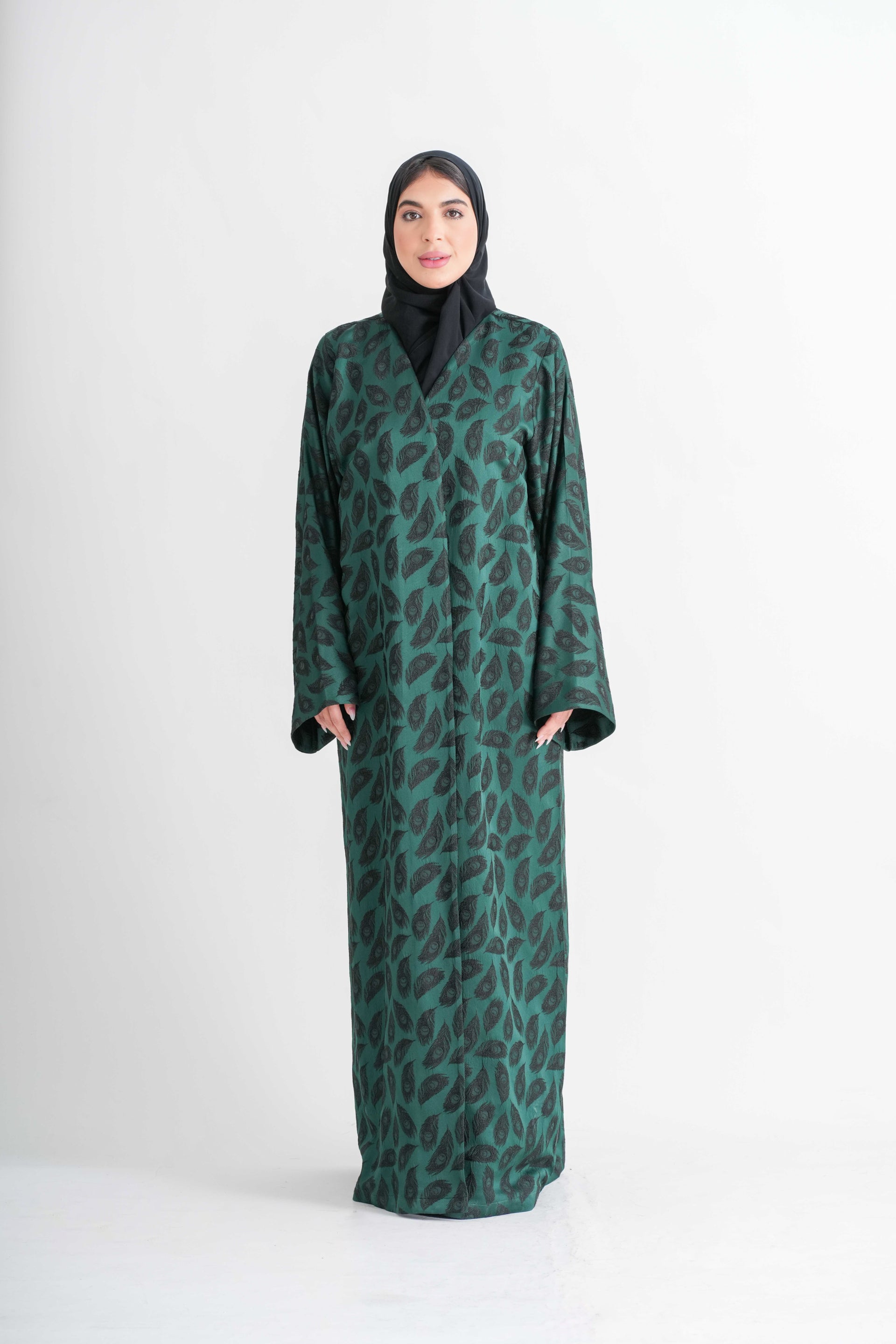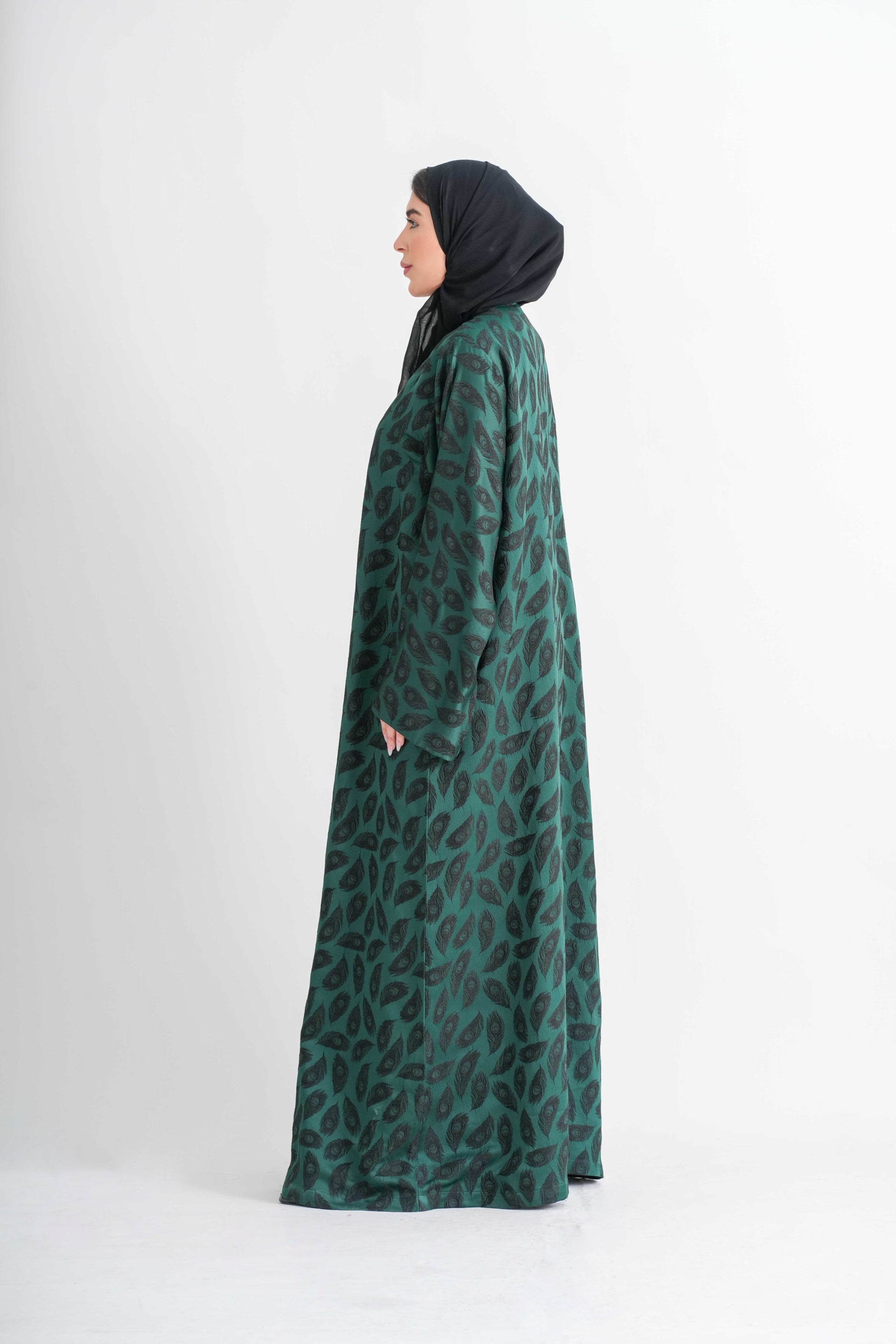 A striking bottle green abaya adorned with a subtle black peacock feather self-print, creating an elegant play of texture and depth. Crafted for graceful movement and effortless sophistication, this piece blends rich colour with artistic detailing, making it perfect for special evenings and refined occasions. An exclusive design available only at Barg Boutique.