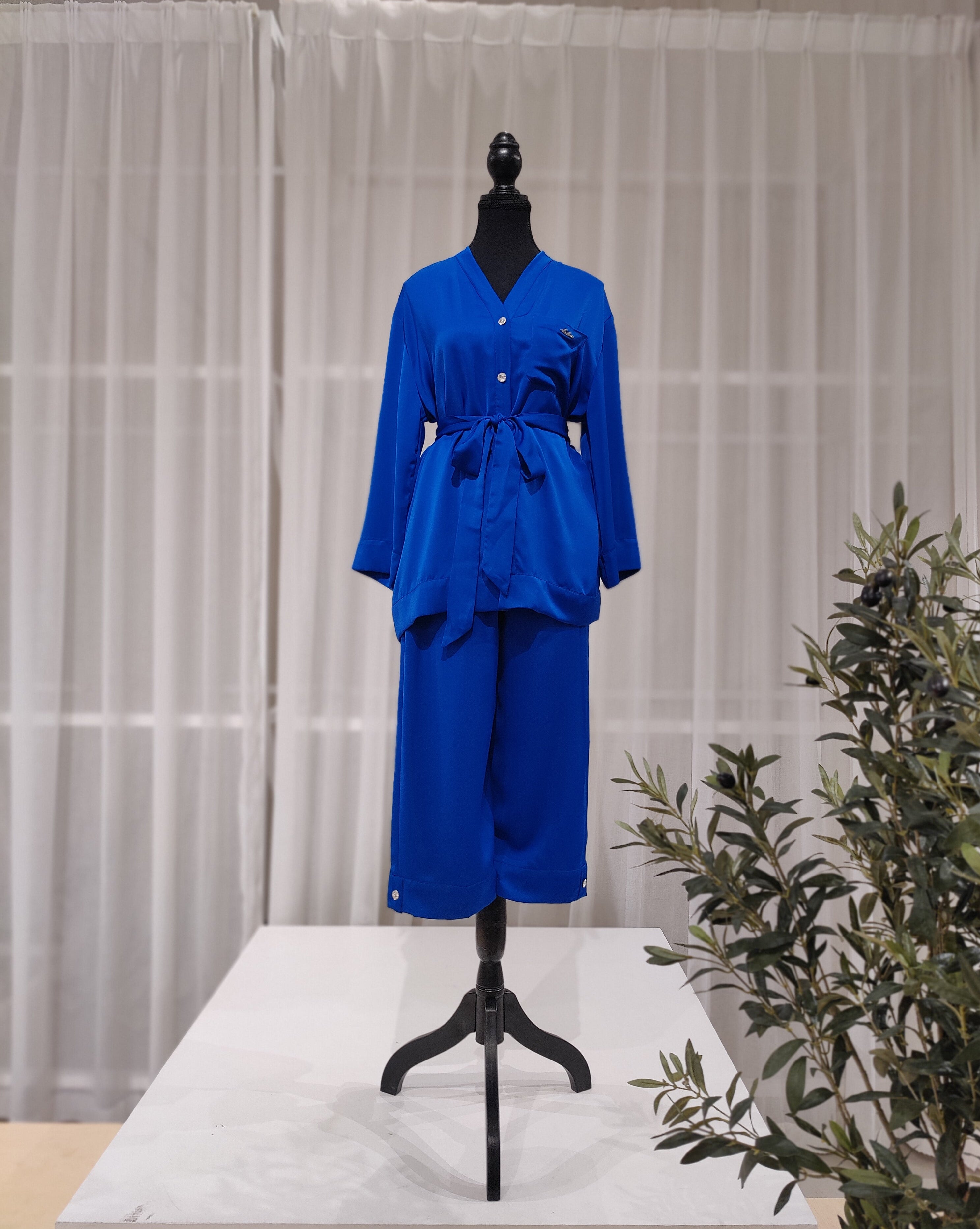 Elegant Royal Blue Pajama set made from buttery-soft poly silk, beauty enhanced by crystal buttons on the shirt and at the bottom edge of the pajamas. A belt that's added extra sharp look. comfort and style forged together.