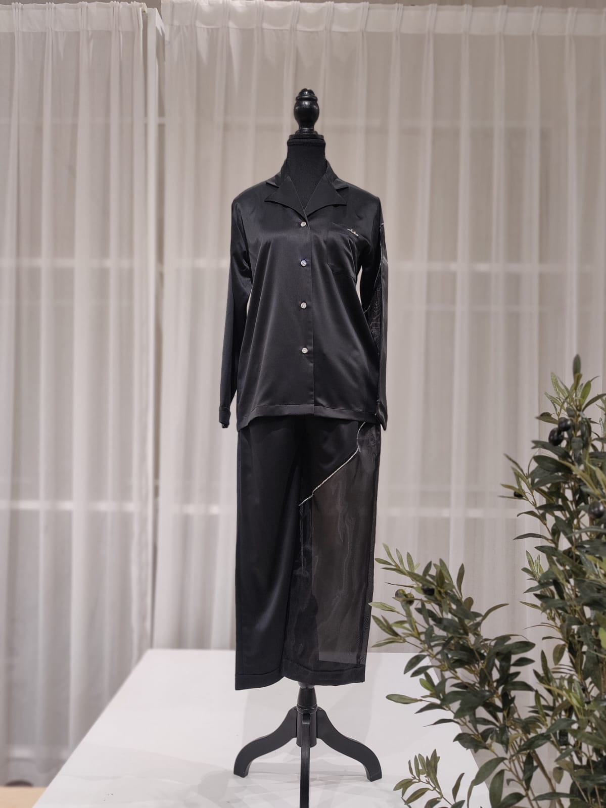 Half of me Pajama set is a smart mix of two materials, poly silk and organza. A unique style with one sleeve as organza and one silk, similar style for the pajama as well with micro crystals on the edge adding edge to comfort.