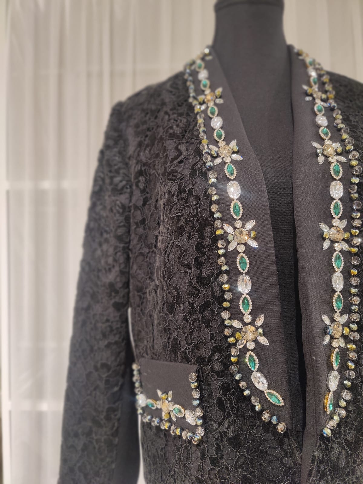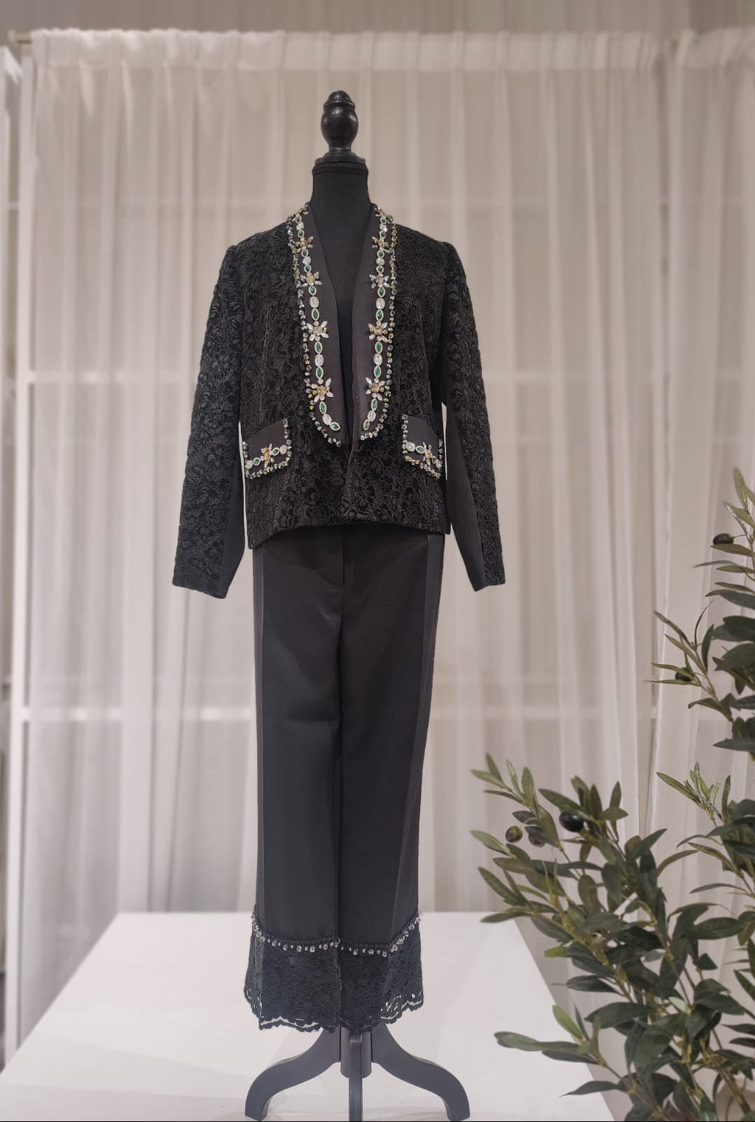 A striking all-black ensemble exclusive to BARG Boutique. Crafted from luxurious black lace-net fabric, this tailored blazer and pant set exudes modern elegance with a seductive edge. Hand-embroidered crystals illuminate the collar and trace the arms, adding a refined sparkle that enhances the depth of the lace.