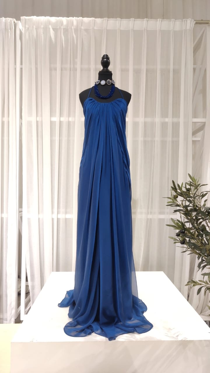 A vision of effortless elegance, the Moonlight Drape Dress flows gracefully in a rich, moonlit blue hue. Crafted with delicate draping that cascades beautifully from neckline to hem, it features a flattering corset back for a timeless silhouette. Perfectly simple yet endlessly sophisticated, this piece embodies understated luxury — a dress to treasure and wear season after season, for every special occasion.
