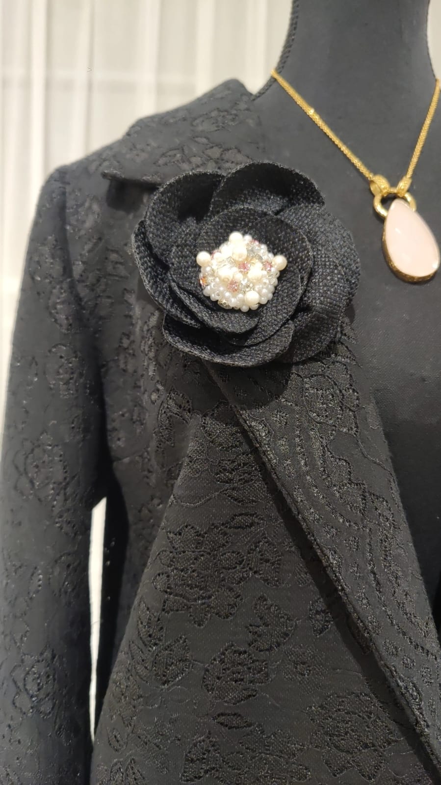 A formal pant and blazer set crafted from breathable cotton net and enriched with an intricate self-lace pattern that adds depth and quiet sophistication. The blazer’s tailored structure is elevated by a delicate flower brooch, offering a touch of refined charm against the rich black fabric. Exclusive to Barg, this set embodies modern elegance with a timeless edge, perfect for moments that call for confidence, finesse, and understated luxury.