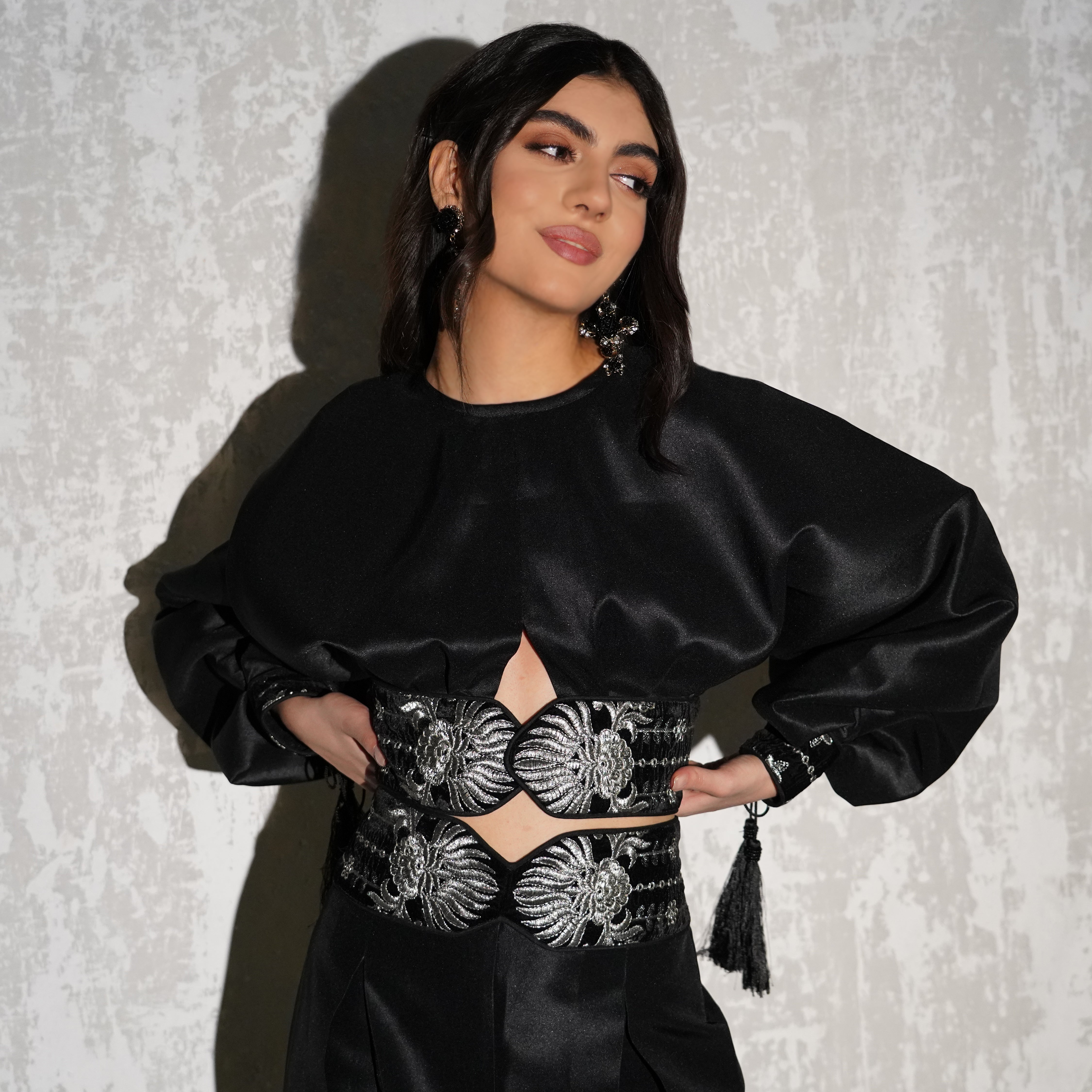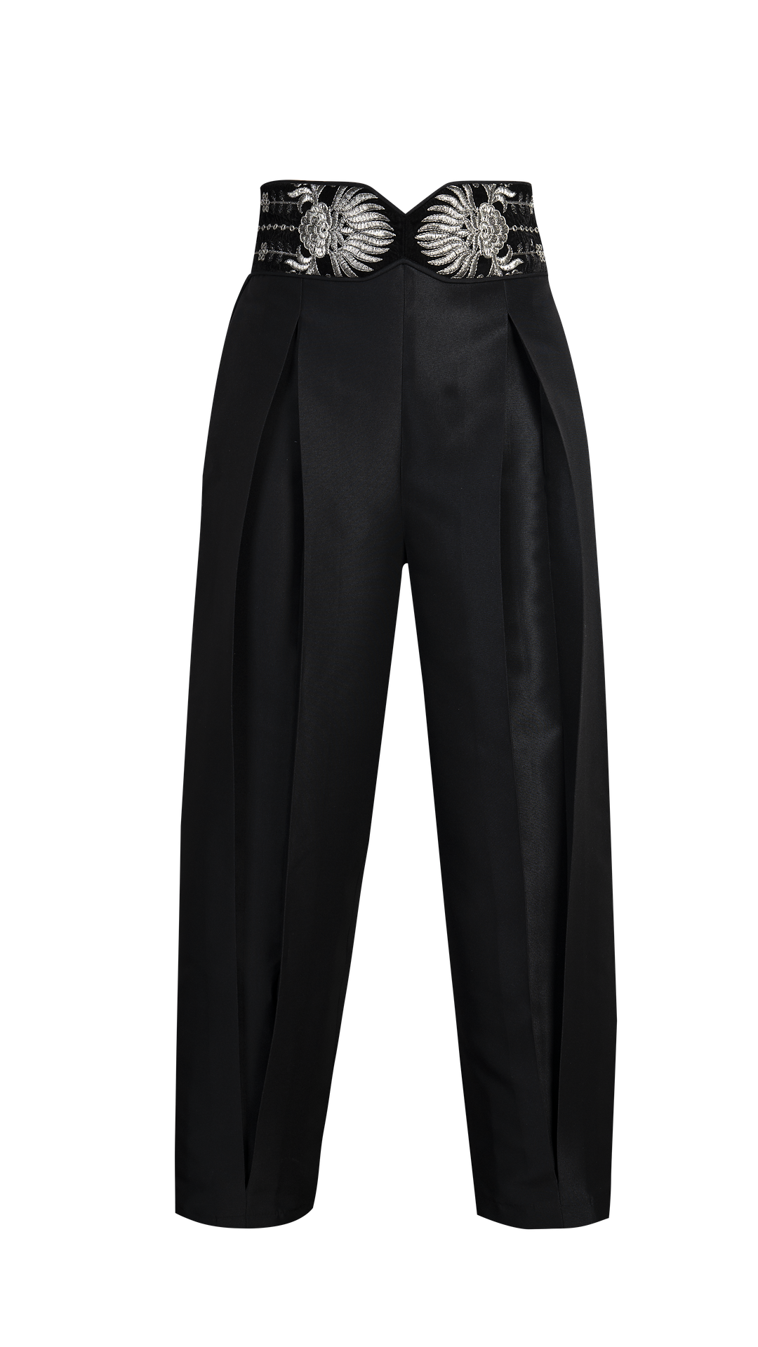 A statement of modern elegance, these satin trousers feature a luxurious velvet belt and intricate silver thread embroidery. The perfect balance of sophistication and style, this piece stands out for its refined detailing. A truly unique design — one that’s sure to draw endless compliments wherever you go.